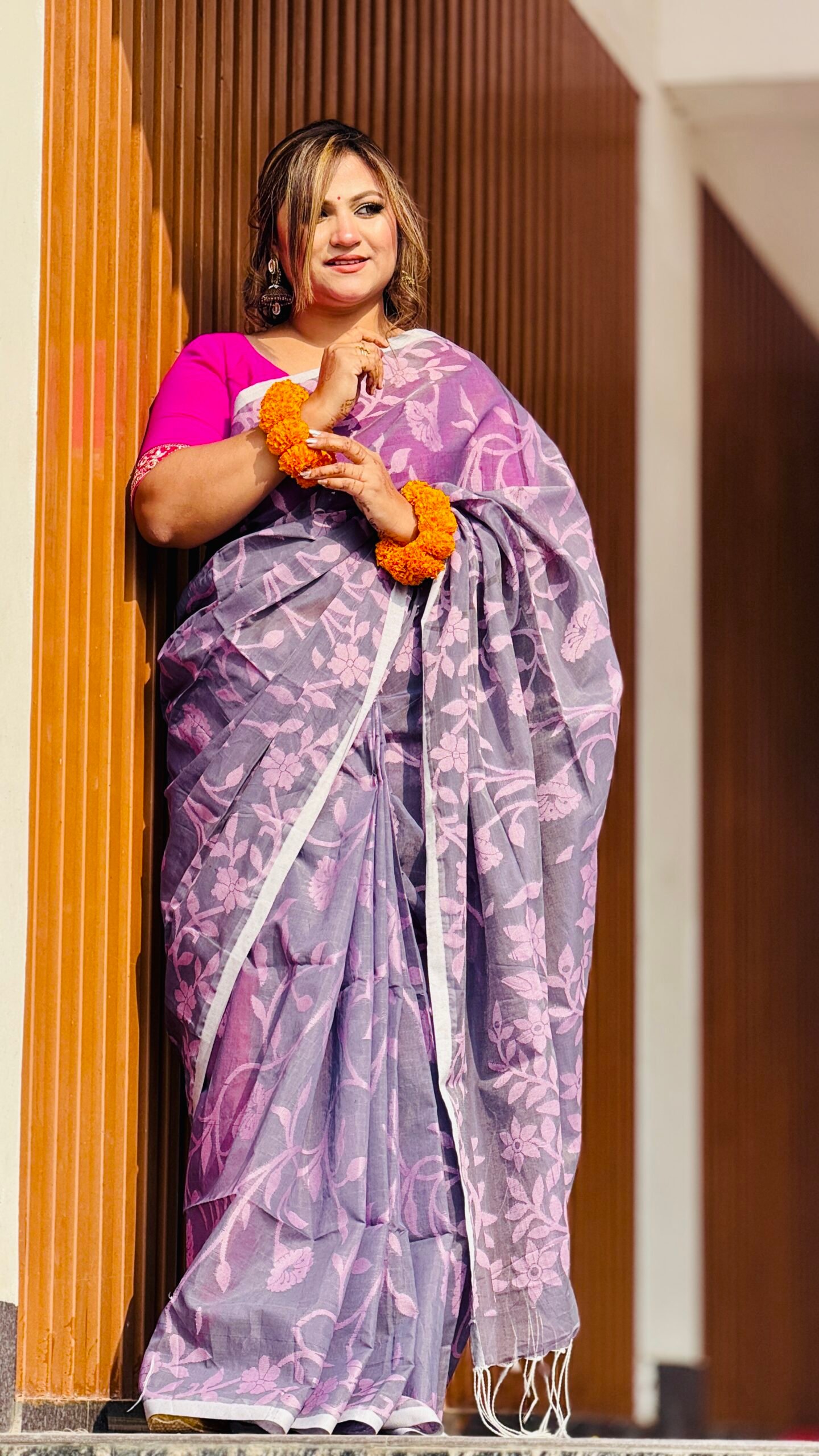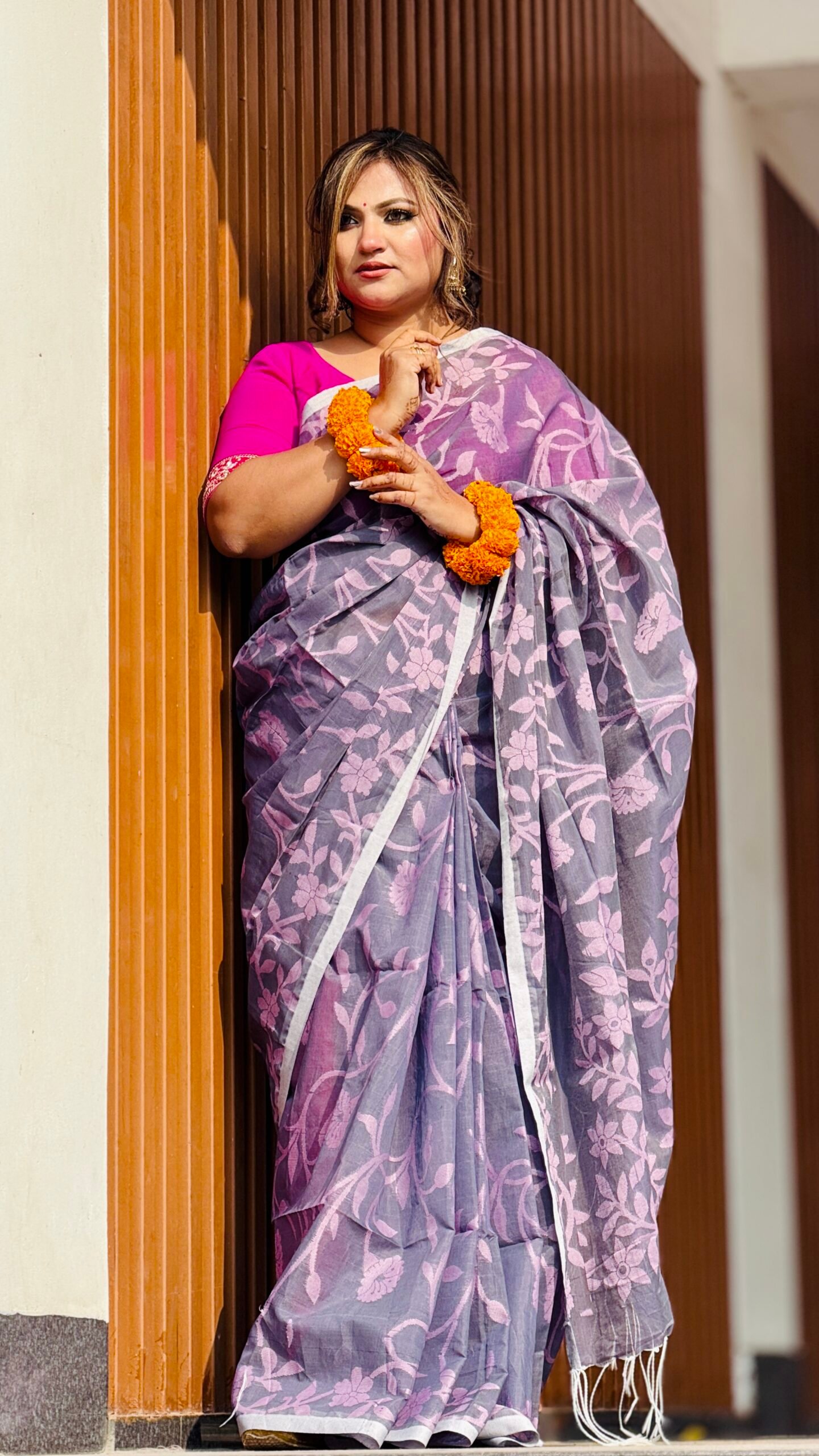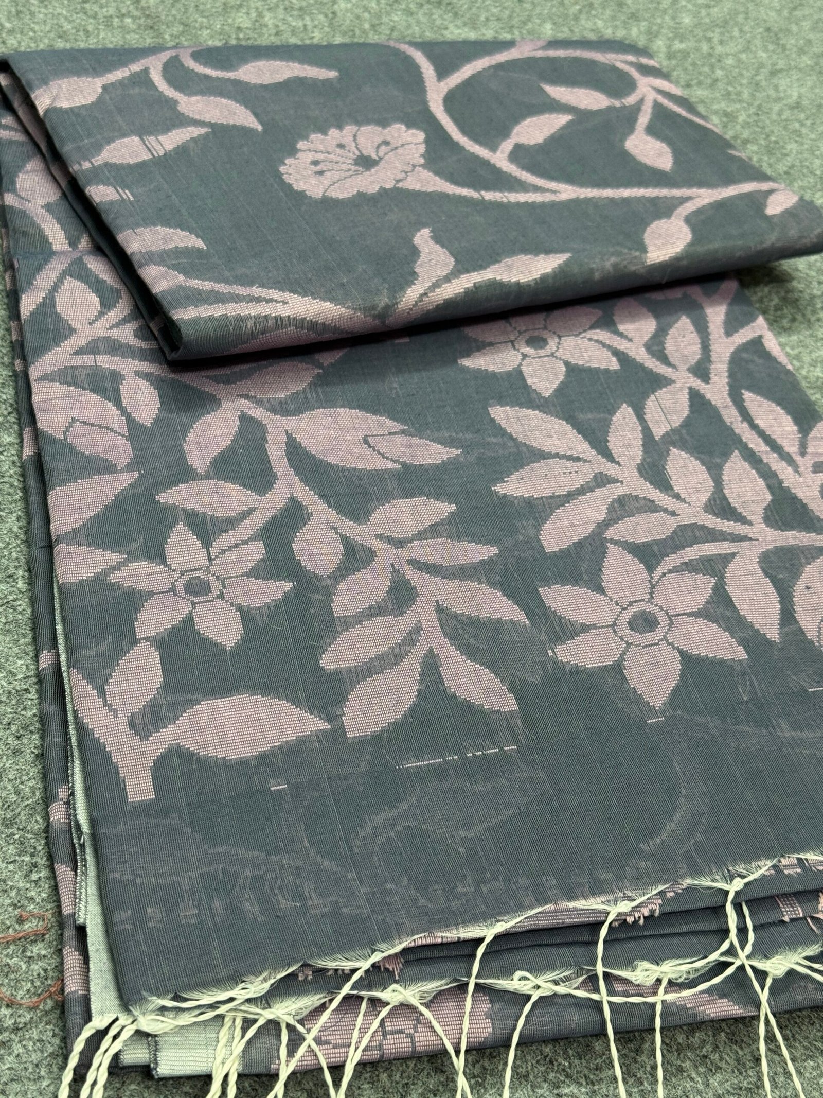 ফ্যাশন এবং স্বাচ্ছন্দ্যের এক অনন্য মেলবন্ধন নিয়ে এলো আমাদের এই হ্যান্ডলুম তন্তুজ কটন শাড়ি। তাঁতশিল্পীদের নিপুণ হাতে বোনা এই শাড়িটি আপনার দৈনন্দিন অফিস লুক কিংবা বিশেষ কোনো আয়োজনে এনে দেবে স্নিগ্ধ আভিজাত্য। শাড়ি জুড়ে থাকা বড় বড় ফ্লোরাল মোটিফটি প্রতিটি ভাঁজে ফুটিয়ে তোলে এক আধুনিক রুচিবোধ।