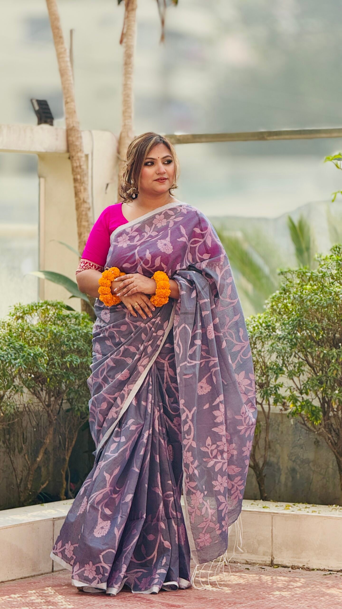 ডিজাইন ও কারুকাজ: সম্পূর্ণ শাড়িতে রয়েছে চমৎকার ফ্লোরাল প্রিন্টের কাজ, যা শাড়িটিকে দিয়েছে এক রিফ্রেশিং লুক। এর আঁচল এবং পাড়ের ফিনিশিং অত্যন্ত নিখুঁত।