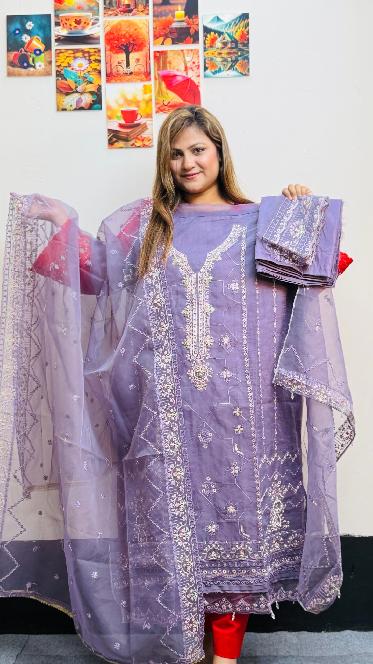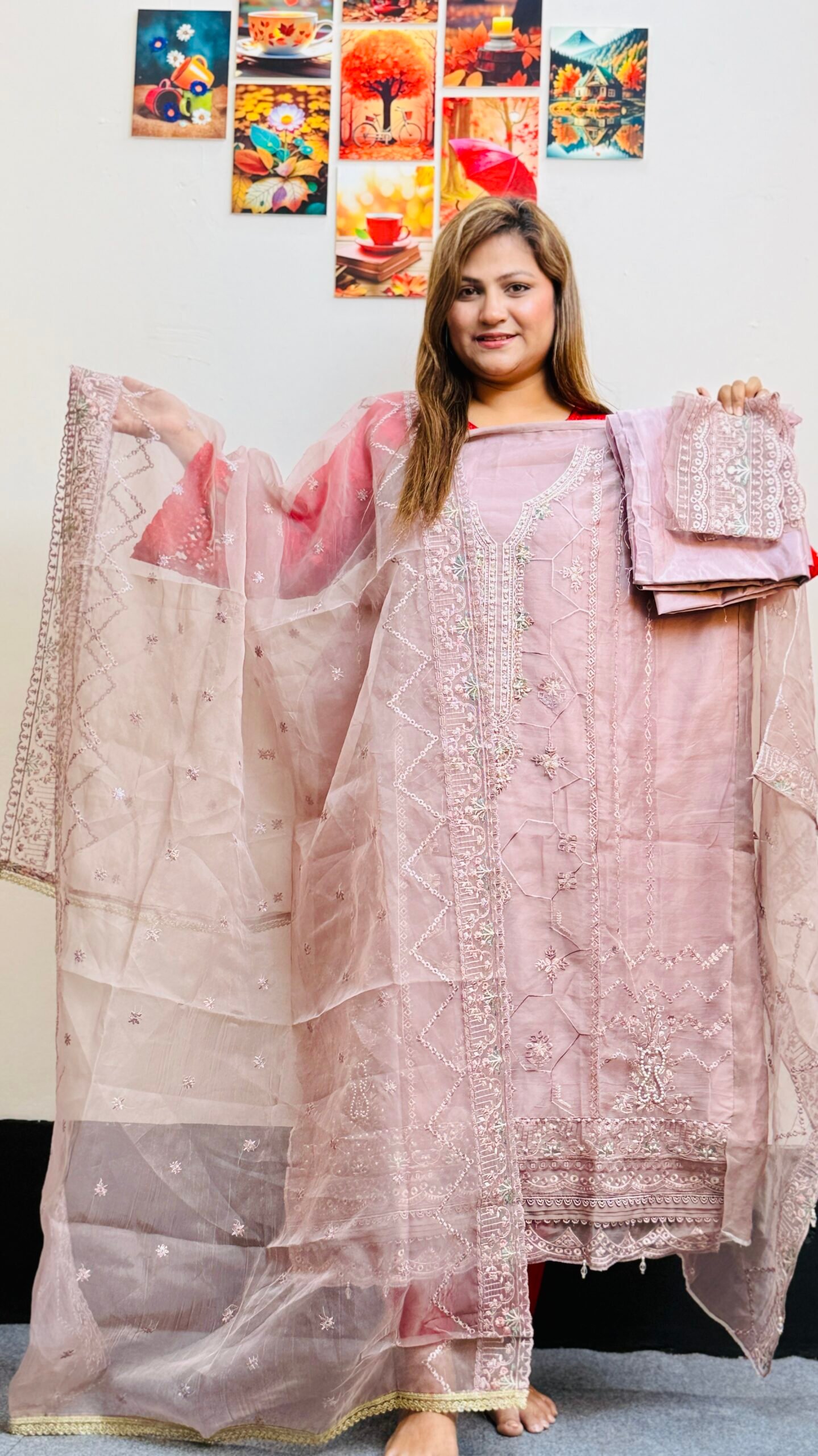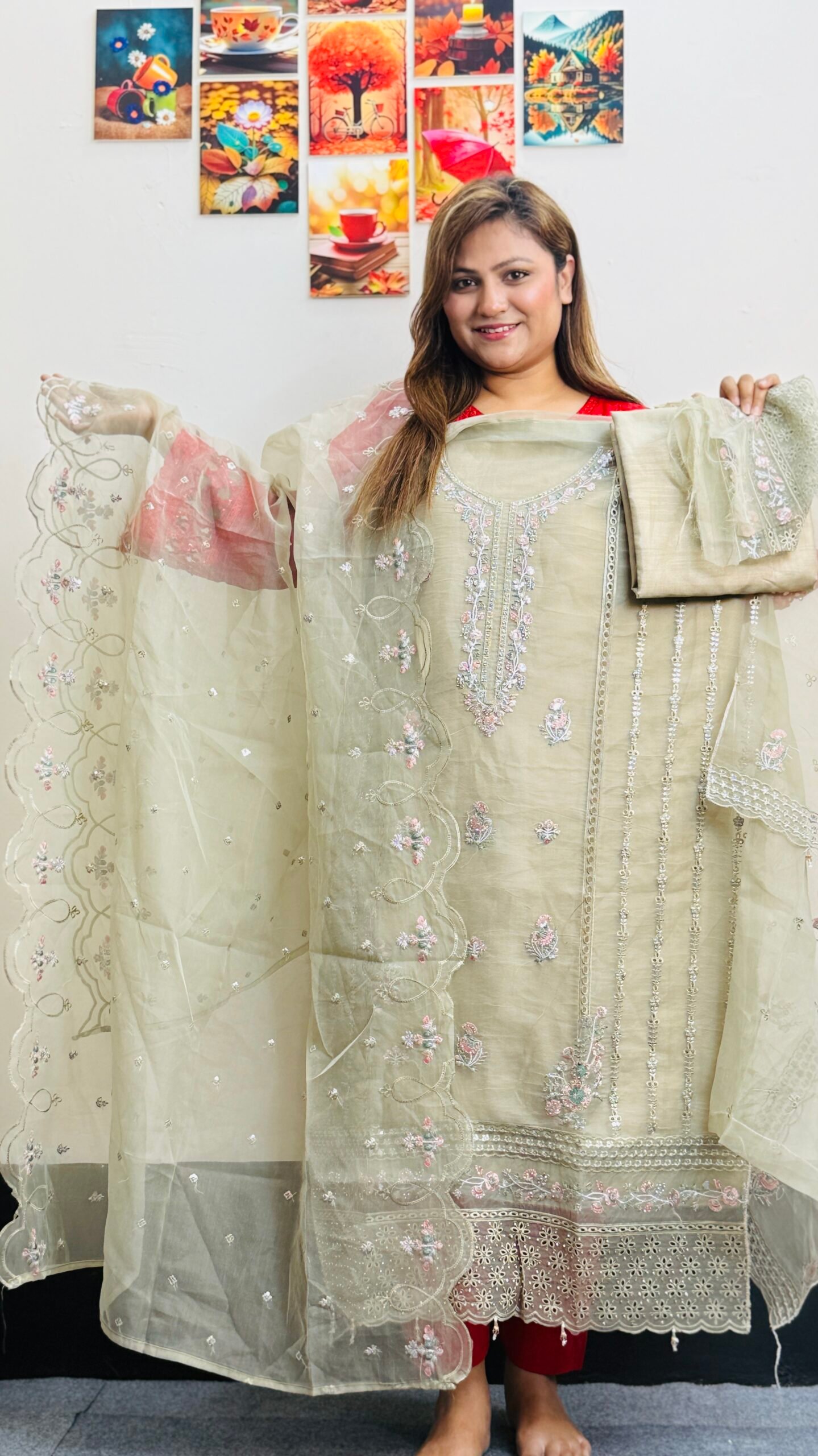 প্রিমিয়াম ফ্যাব্রিক: কামিজ এবং ওড়না তৈরি করা হয়েছে উন্নত মানের অর্গানজা দিয়ে, যা আপনাকে দেবে এক ইথারিয়াল এবং প্রিমিয়াম ফিল।